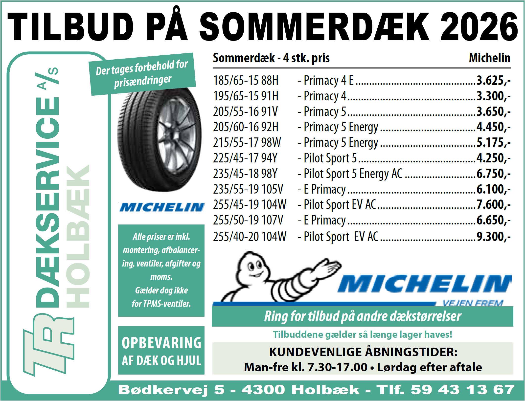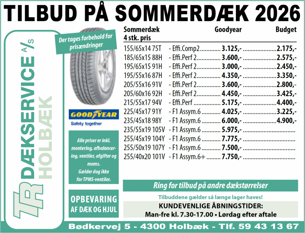 På grund af krav fra Arbejdstilsynet kan vi ikke tilbyde at løfte hjul/dæk ind og ud af kundebiler. Udtagning og indlægning af hjul/dæk skal derfor foretages af kunden selv. Vi beklager ulemperne, men vi følger naturligvis gældende arbejdsmiljøregler og værner om vores medarbejderes sundhed og sikkerhed